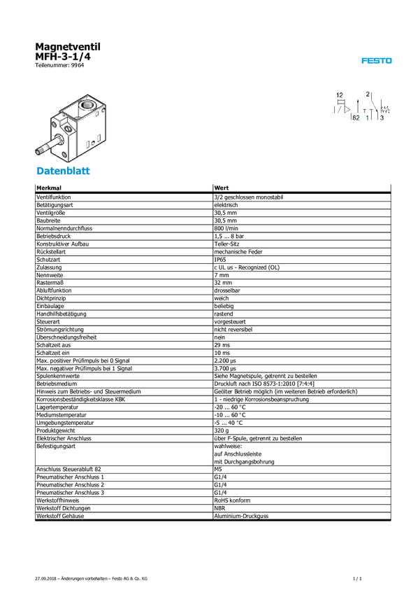 Zawór magnetyczny FESTO MFH-3-1/4 9964, 1.5 do 8 bar