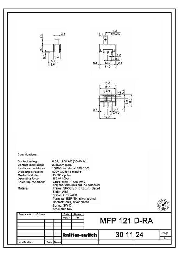 Switch Slide Side Slide 0.35A 30VDC 10000Cycle PC Pins Thru-Hole
