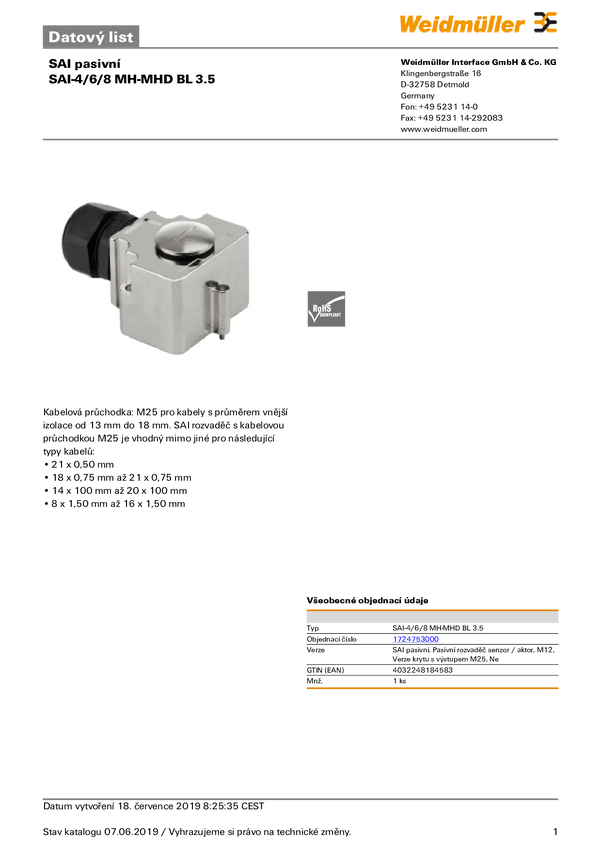 Rozdzielacz czujnik / element wykonawczy, pasywny Weidmüller SAI-4/6/8 MH-MHD BL 3.5 1724753000 1 szt.