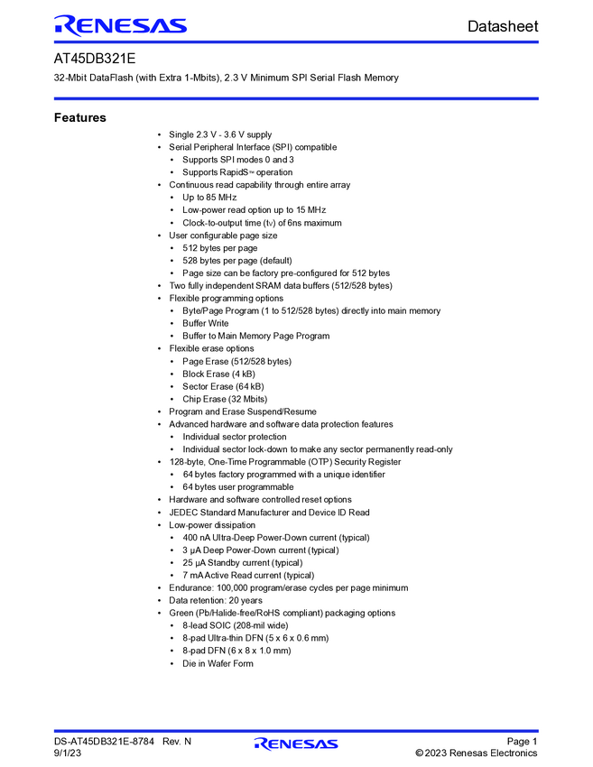 32Mbit, 2.3V to 3.6V Range SPI Serial Flash Memory