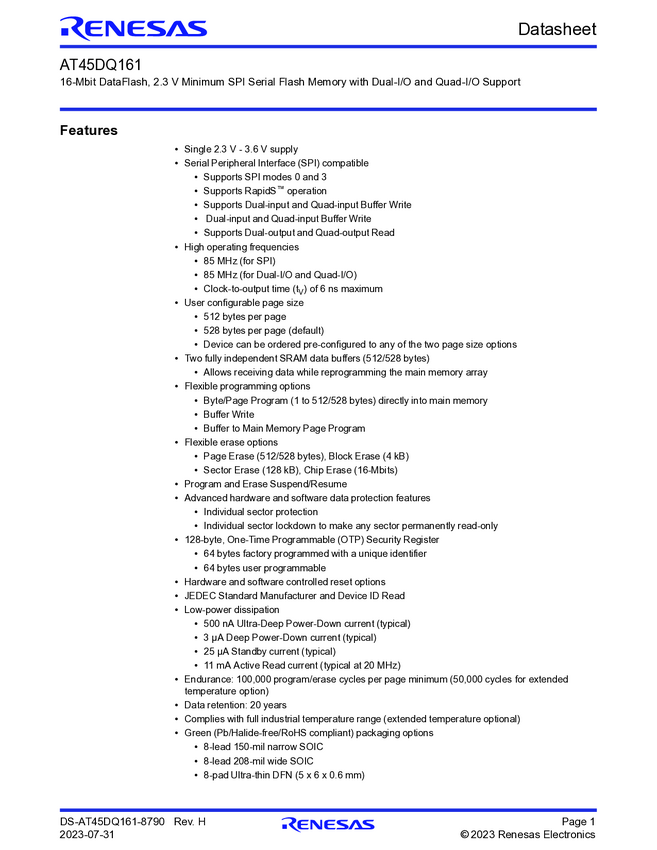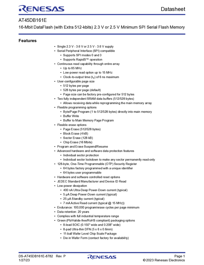 16Mbit, 2.3V to 3.6V Range SPI Serial Flash Memory
