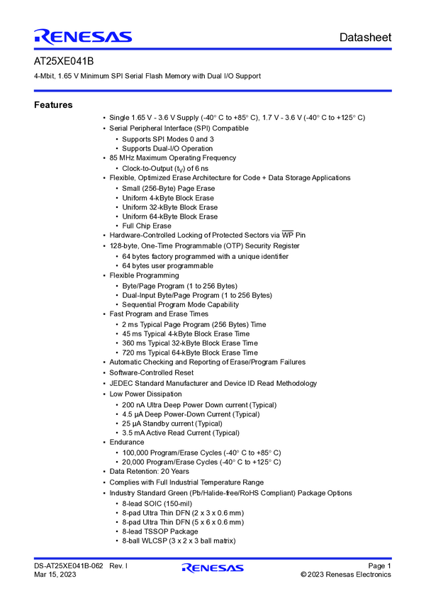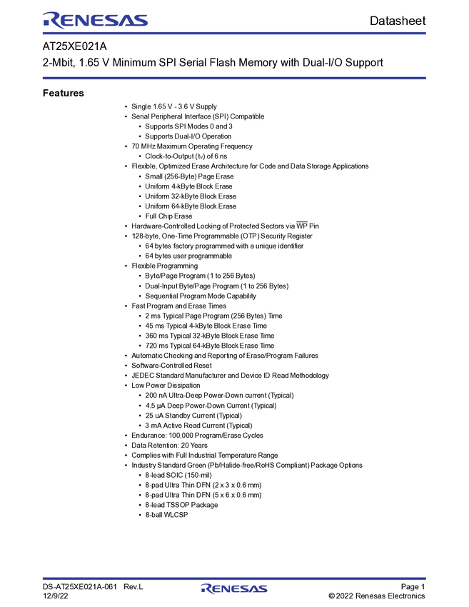 2 Mbit, 1.65 V to 3.6 V Range SPI Serial Flash Memory with Dual I/O Support