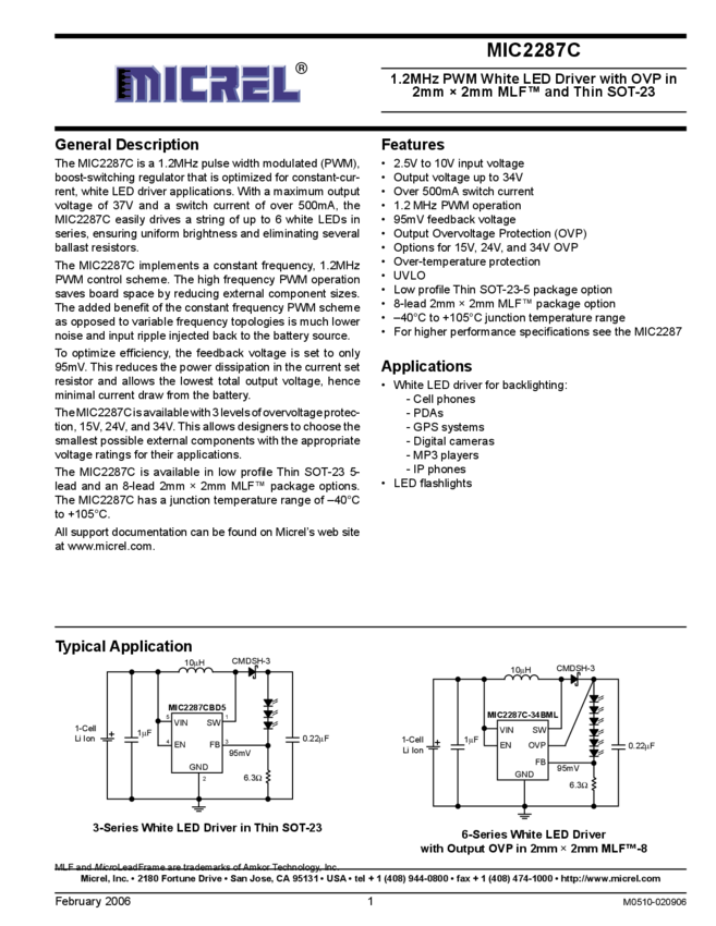 MIC2287C - 1.2MHz PWN White LED Driver with OVP (11/05/2015)