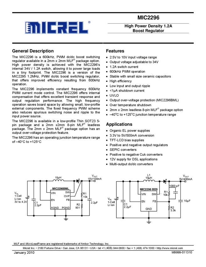 MIC2296 - High Power Density 1.2A Boost Regulator (11/05/2015)