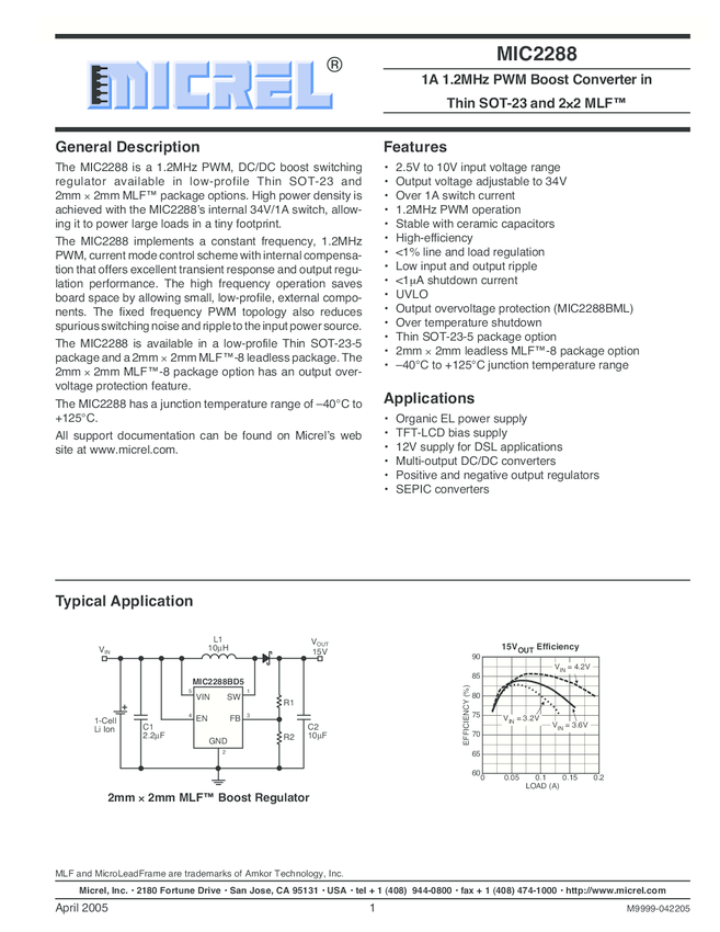 MIC2288 - 1A 1.2MHz PWM Boost Converter in Thin SOT-23 and 2x2 MLF? (11/05/2015)