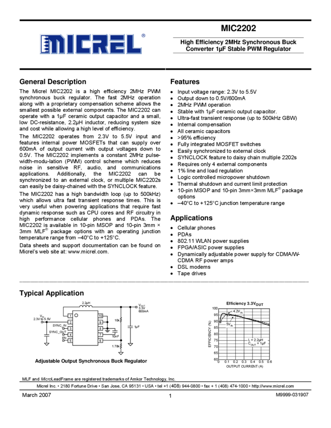MIC2202 - High Efficiency 2MHz Synch Buck Converter 1µF Stable PWM Regulator (11/05/2015)