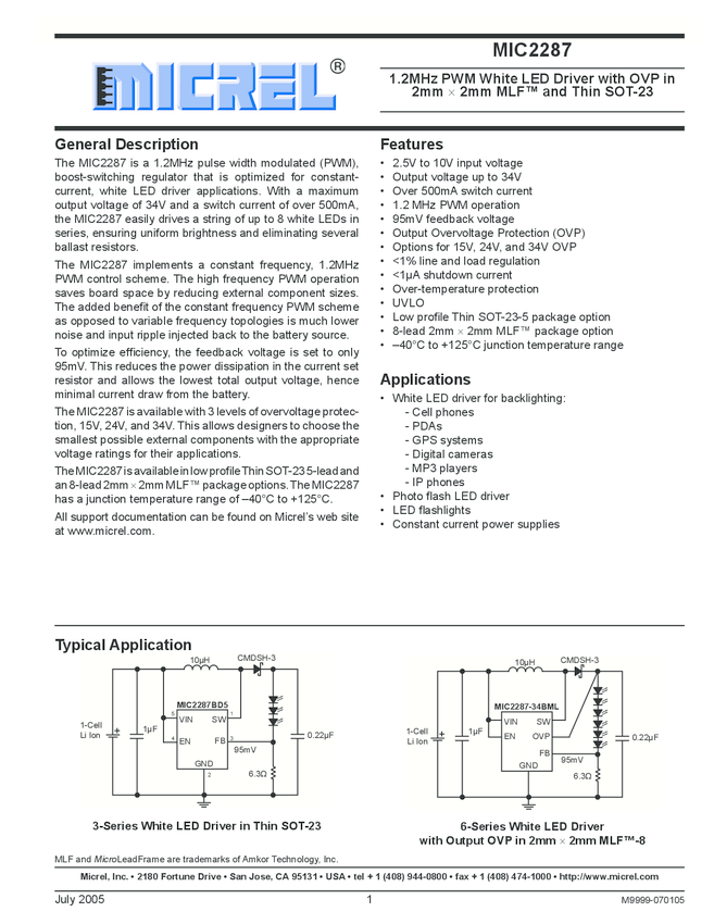 MIC2287 - 1.2MHz PWN White LED Driver with OVP (11/05/2015)