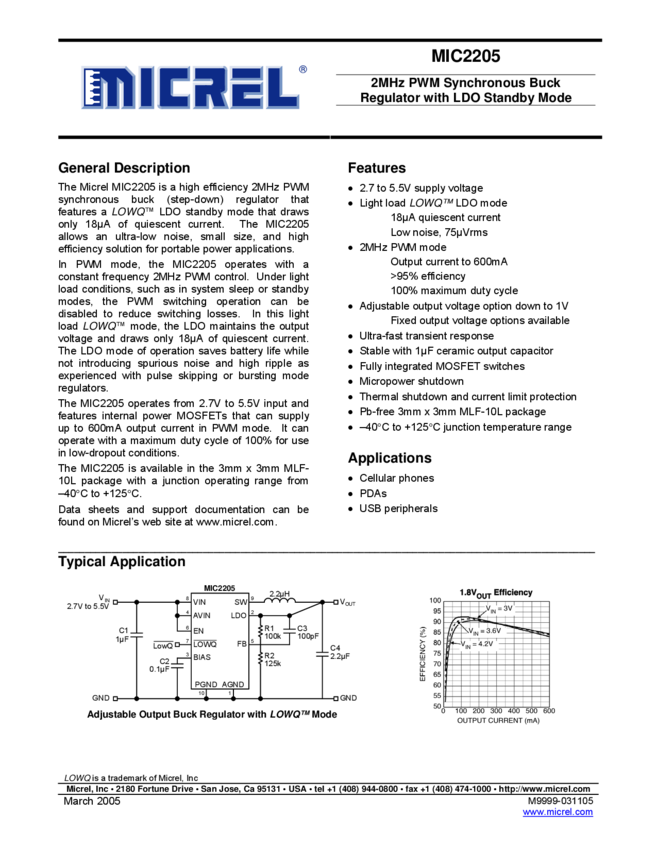MIC2205 - 2MHz PWM Synchronous Buck Regulator with LDO Standby Mode (11/05/2015)