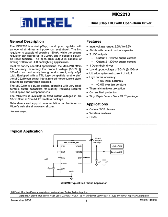 MIC2210 - Dual µCap LDO with Open-Drain Driver (11/05/2015)