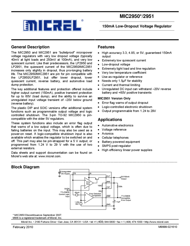 MIC2950/2951 - 150mA Low-Dropout Voltage Regulator (11/05/2015)