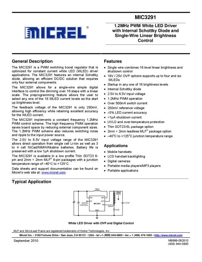 MIC3291 - 1.2MHz PWM White LED Driver with Internal Schottky Diode (11/09/2015)