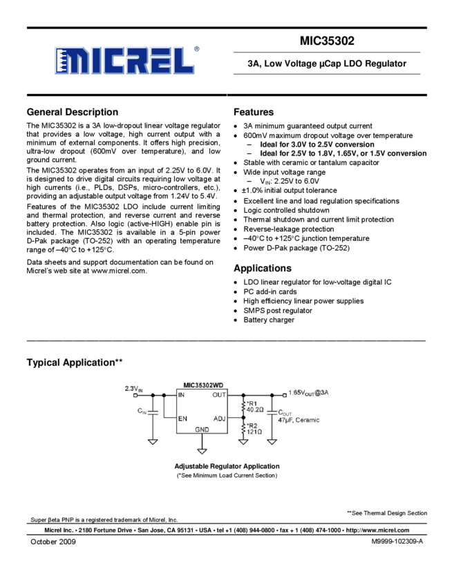 MIC35302-3A, Low Voltage µCap LDO Regulator