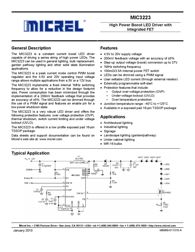MIC3223 - High Power Boost LED Driver with Integrated FET (11/09/2015)