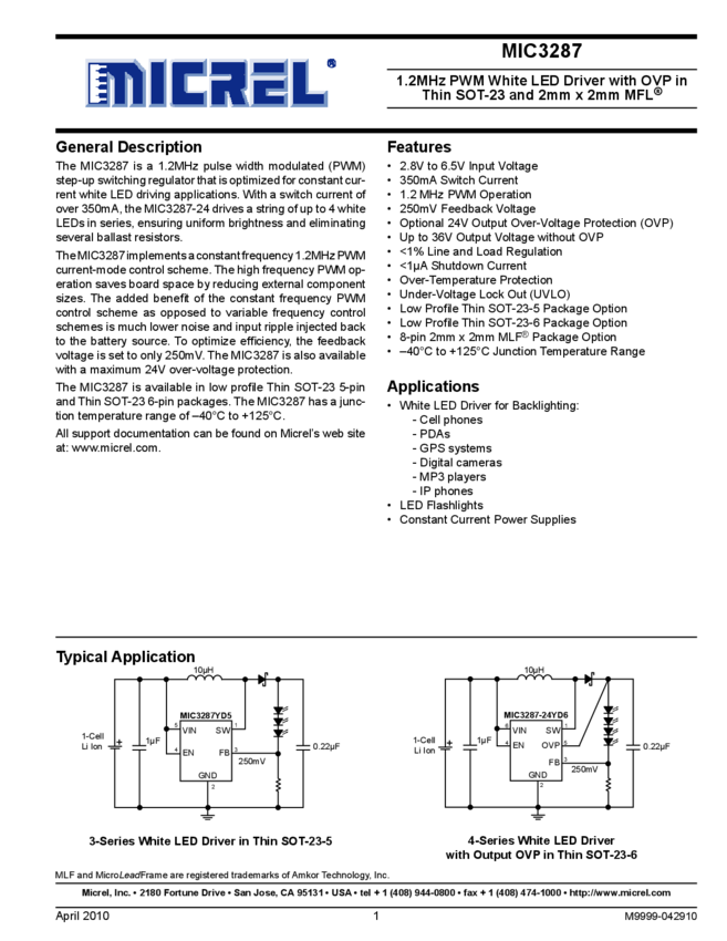 MIC3287 - 1.2MHz PWM White LED Driver with OVP in Thin SOT-23 & 2mm x 2mm MFL® (11/09/2015)