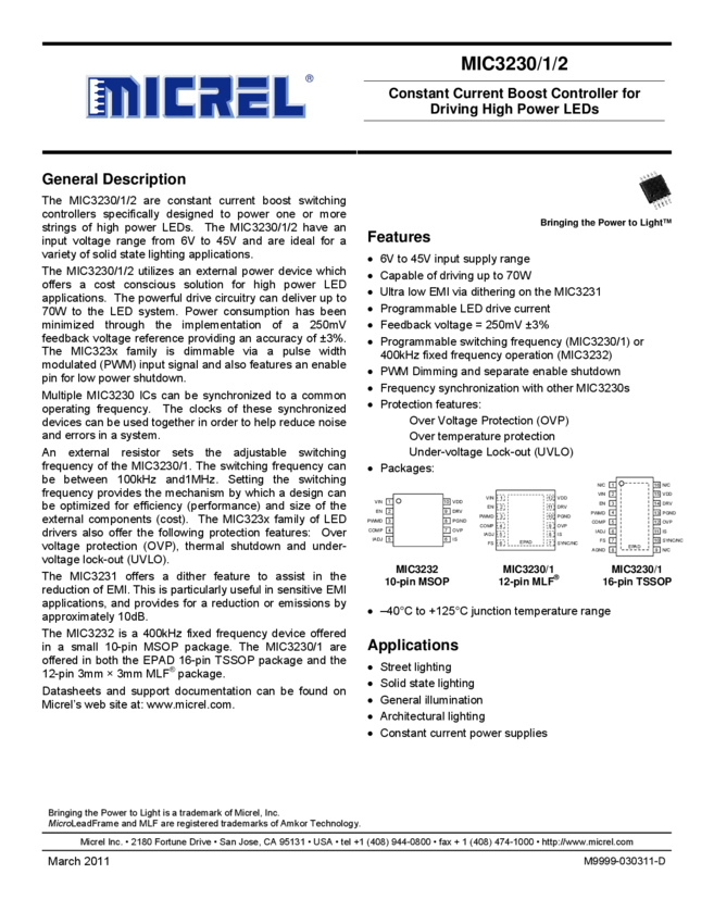MIC3230/1/2 - Constant Current Boost Controller for Driving High Power LEDs (11/09/2015)