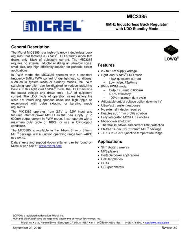 MIC3385-8MHz Inductorless Buck Regulator with LDO Standby Mode