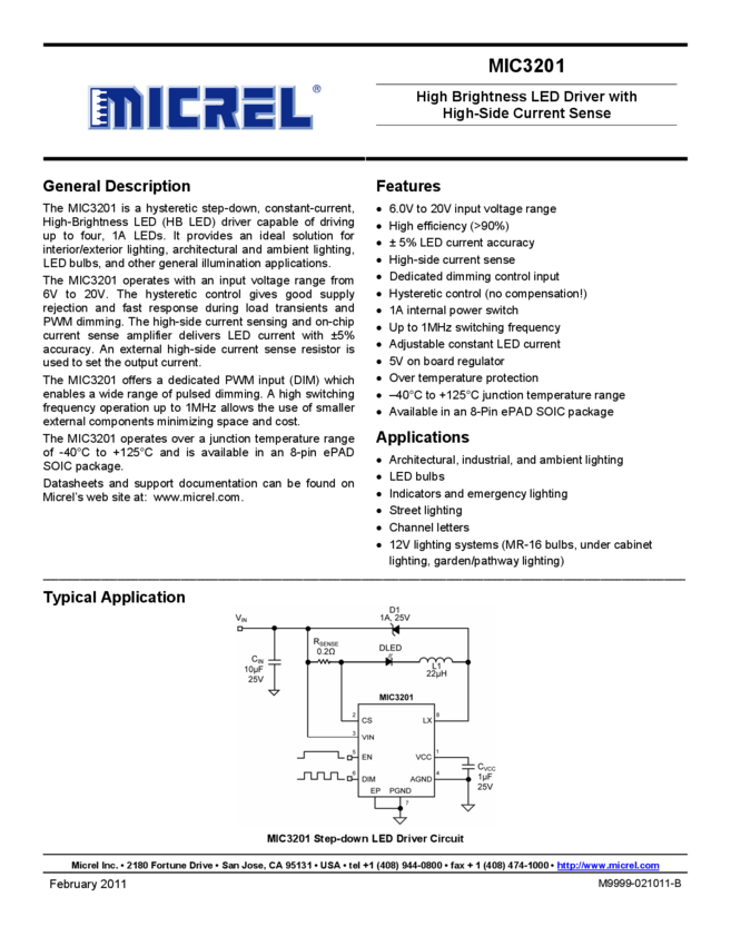 MIC3201 - High Brightness LED Driver with High-Side Current Sense (11/09/2015)