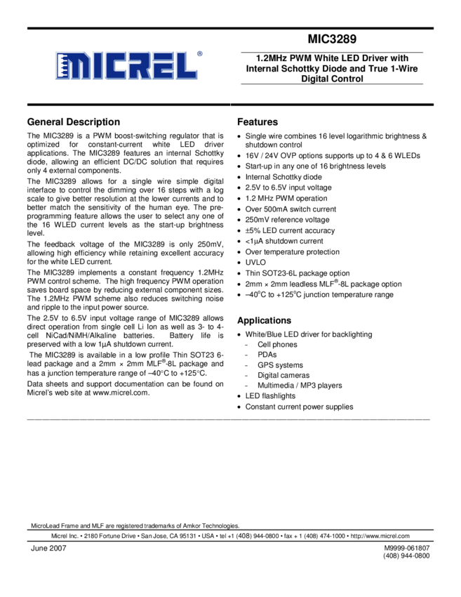 MIC3289 - 1.2MHz PWM White LED Driver with Internal Schottky Diode (11/09/2015)