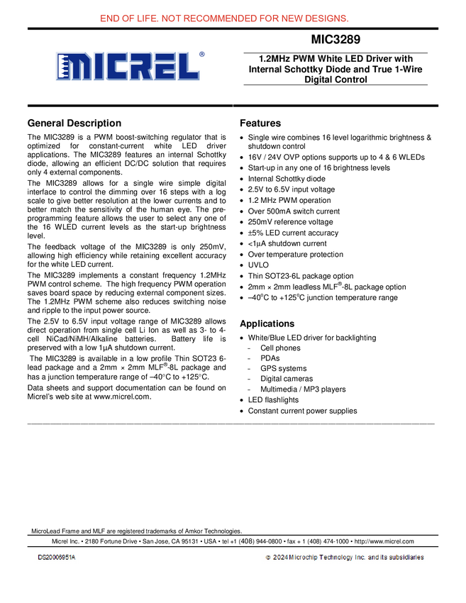 MIC3289 - 1.2MHz PWM White LED Driver with Internal Schottky Diode (11/09/2015)