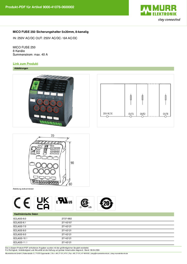 Murrelektronik 9000-41078-0600002 MICO FUSE 250 Uchwyt bezpiecznika Kompatybilne bezpieczniki 5 x 20 mm 6 A 250 V/AC, 25