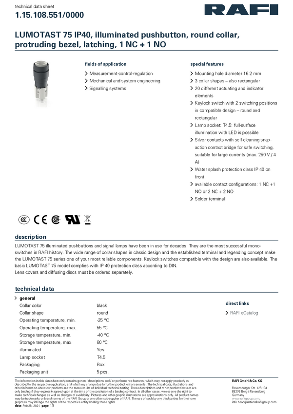 RAFI 1.15.108.551/0000 MICON Przycisk podświetlany 230 V 4 A zatrzask (D x S x W) 18 x 18 x 49 mm IP40 1 szt.