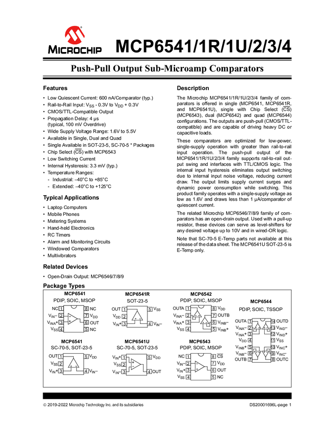 MCP6541/1R/1U/2/3/4 Push-Pull Output Sub-Microamp Comparators Data Sheet