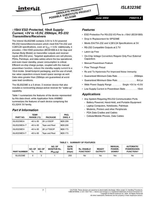 ±15kV ESD Protected, +3V To +5.5V, 0.01 Microamp, 250kbps, RS-232 Transmitter/Receiver