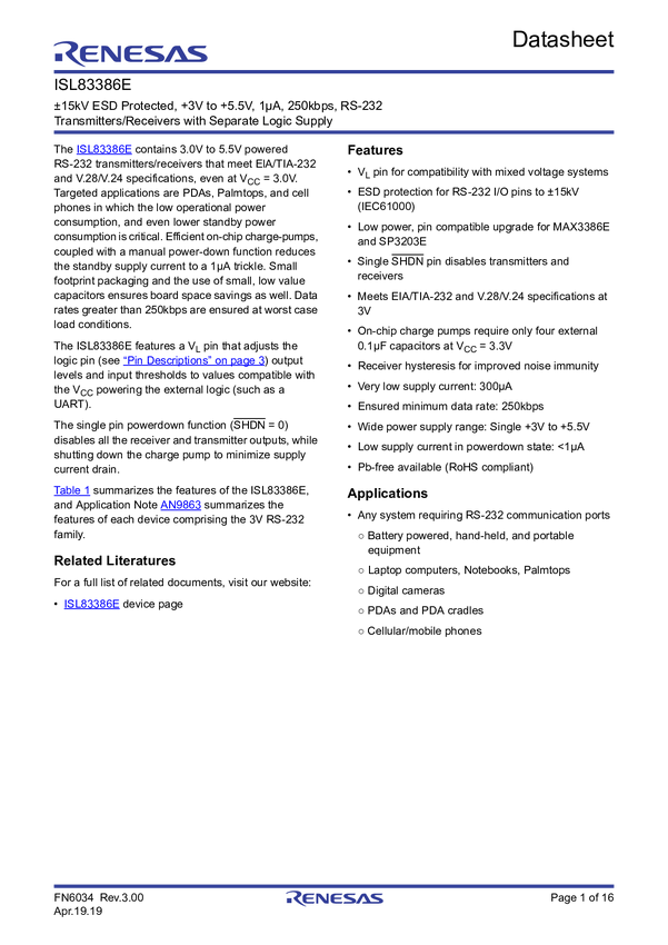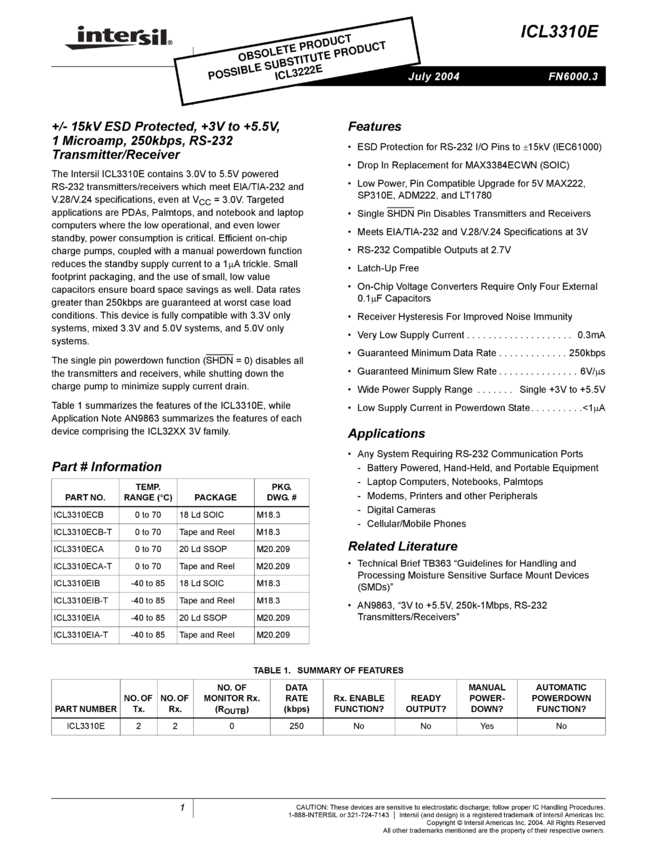 ±15kV ESD Protected, +3V To +5.5V, 1 Microamp, 250kbps, RS-232 Transmitter/Receiver