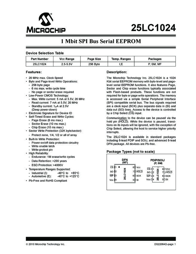 25LC1024 1 Mbit SPI Bus Serial EEPROM Data Sheet (05/24/2010)