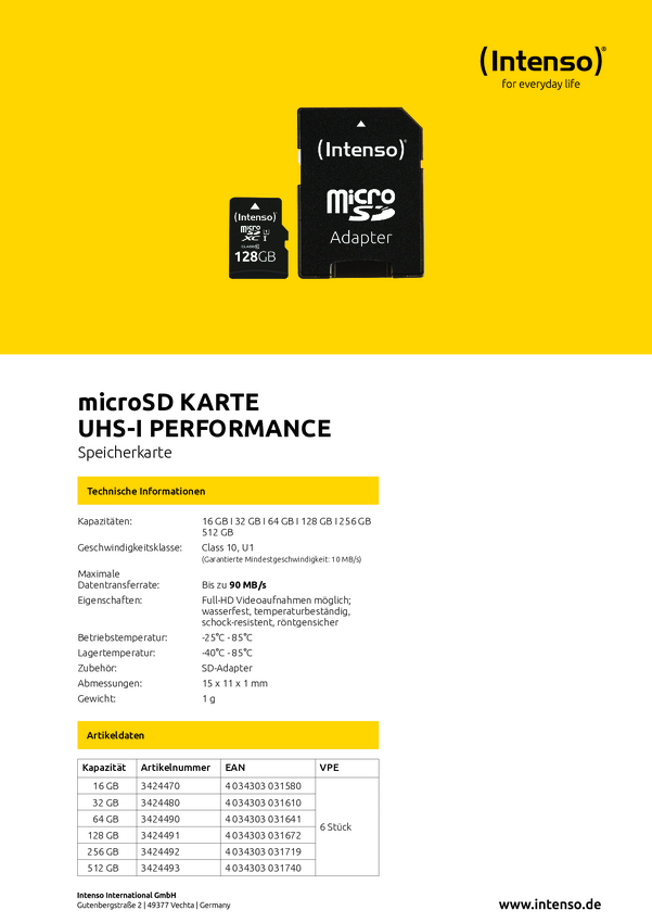 Intenso 16GB microSDHC Performance microSD 16 GB Class 10 UHS-I wodoszczelny