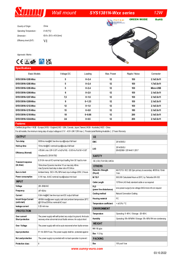 Zasilacz wtyczkowy SUNNY 5V 2,4A 12W microUSB | SYS1381N-1205-W2E