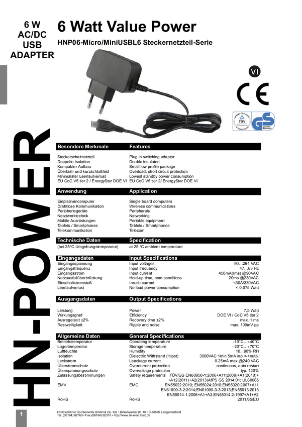 HN Power HNP06-MICROUSBL6 Ładowarka USB 7.5 W 1x Micro-USB czarny dom stabilizacja
