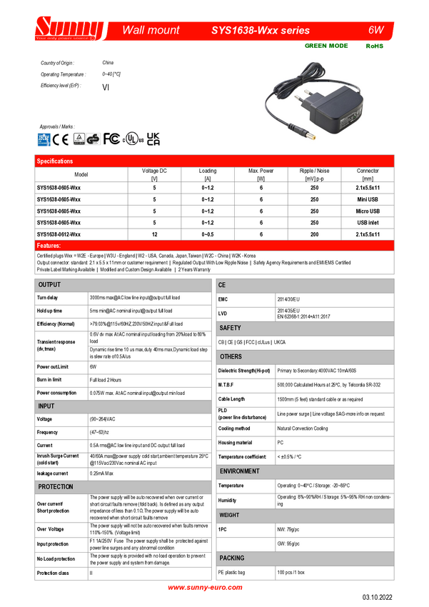 Zasilacz wtyczkowy SUNNY 5V 1,2A 6W microUSB | SYS1638-0605-W2E