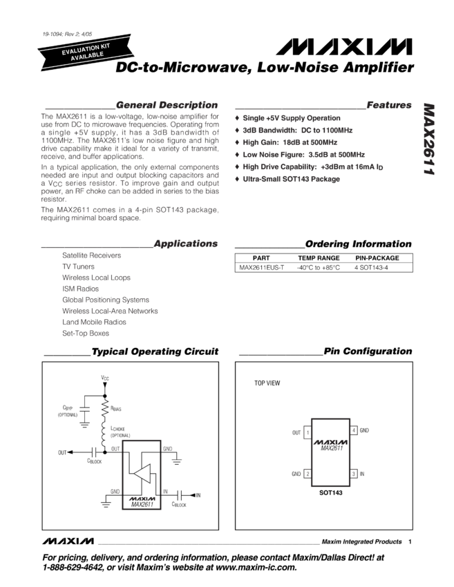 MAX2611 DC-to-Microwave, Low-Noise Amplifier