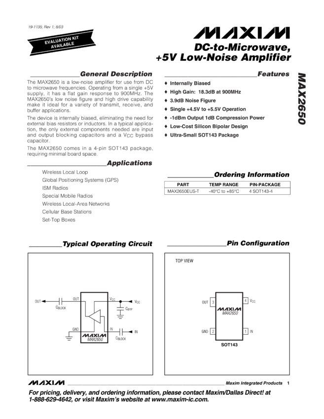 MAX2650 DC-to-Microwave, +5V Low-Noise Amplifier