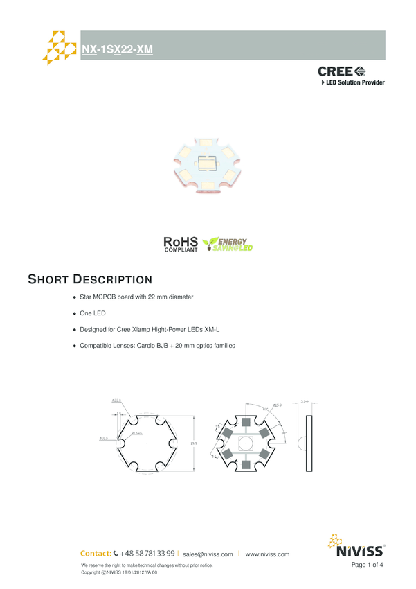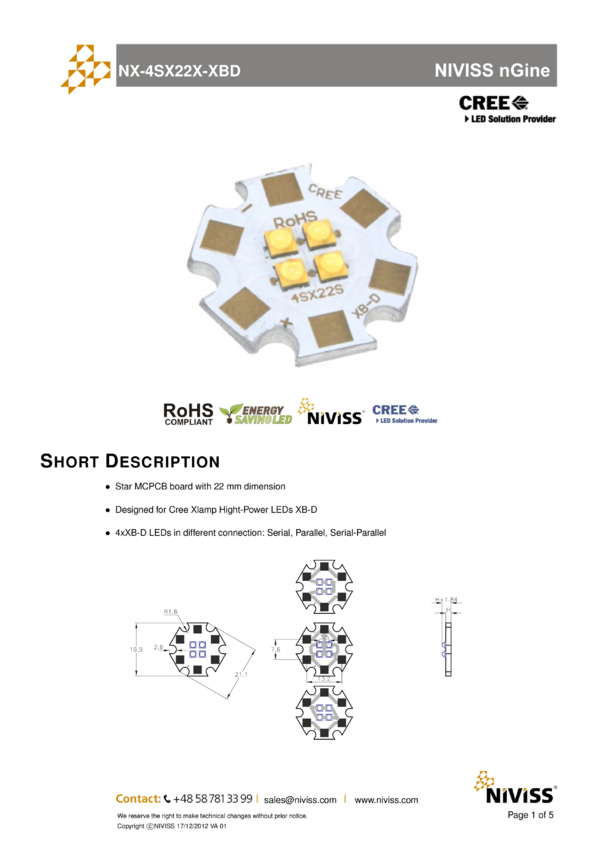 Moduł 4x LED Cree XB-D, , jasność Q3-93.9lm/350mA, barwa 7A4, gwiazdka 22mm, połączenie szeregowo-równoległe diod (2x2 LED), grubość 2mm, miedź 35um, biała soldermaska, powlekane złotem, formatka=24szt