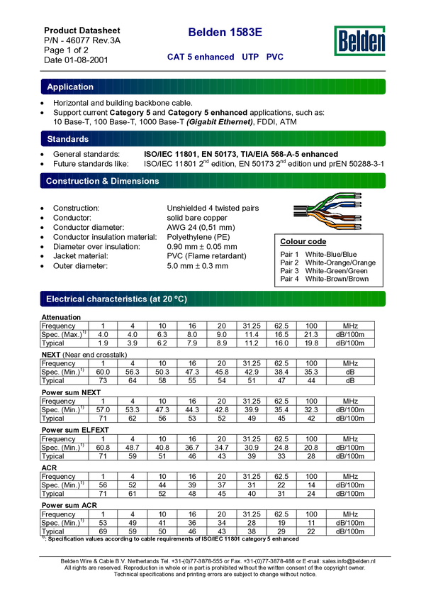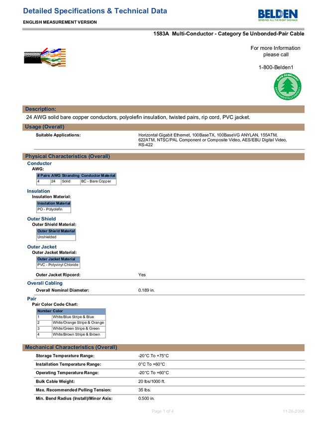 Kabel miedziany Belden U/UTP kat.5e drut PVC skrętka 305m zielony