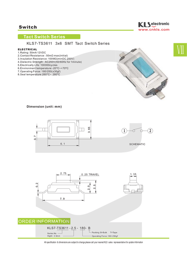Mikroprzycisk 3,7x6,1mm; 2,5mm; TS3611-2,5; SMD; 2 pin; 0,5mm; OFF-(ON); 50mA; 12V DC; 180gf; KLS; RoHS; opakowanie/100szt