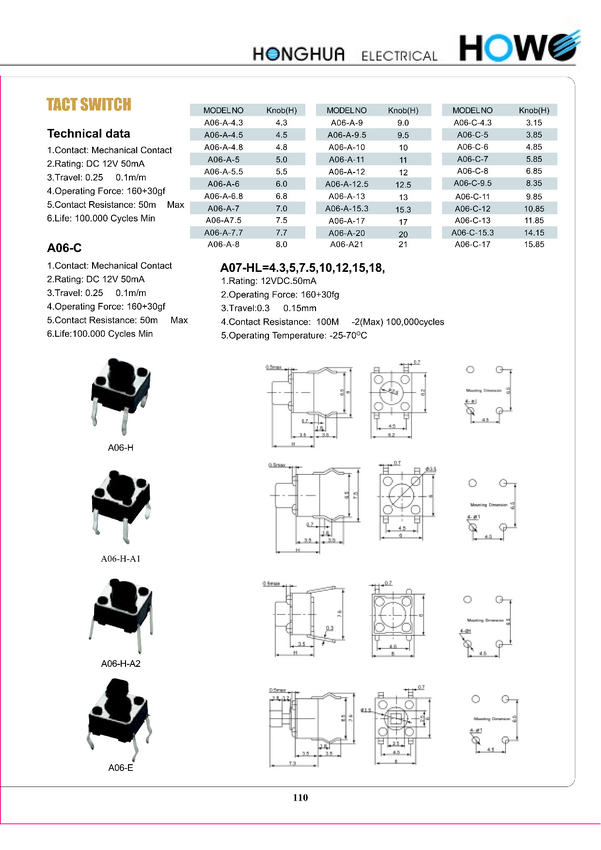 Mikroprzycisk; 6x6mm; 7mm; A06-A-7; 3,5mm; THT; 4 pin; czarny; OFF-(ON); 50mA; 12V DC; 160gf; KLS; RoHS; opakowanie/100szt