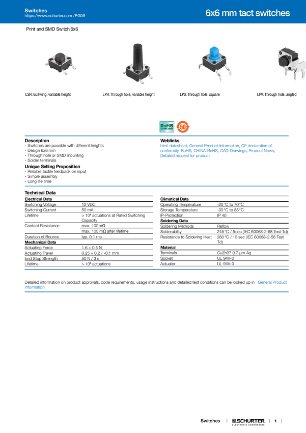 Mikroprzycisk; TACT; 1301.9314.24; 6x6mm; 4,3mm; SMD; 4 pin; 0,7mm; OFF-(ON); 50mA; 12V DC; 1,6N; SCHURTER; RoHS; op/100szt