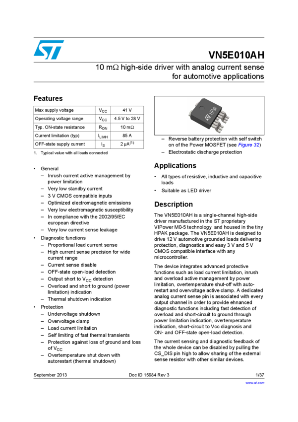 Double 4 milliohm high-side driver with analog current sense for automotive applications
