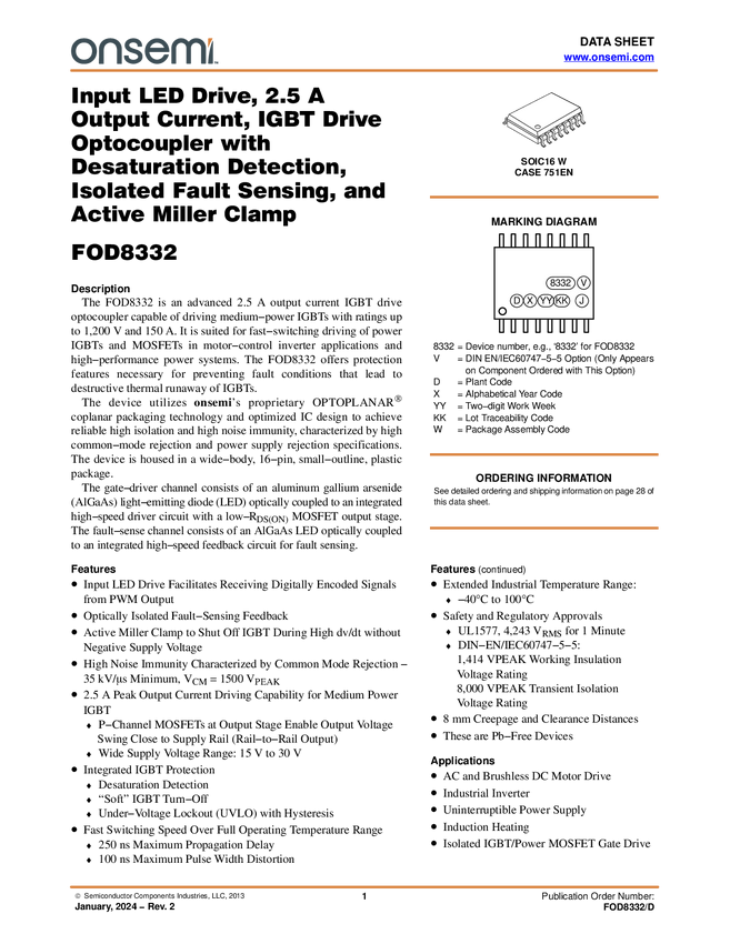 Input LED Drive, 2.5 A Output Current, IGBT Drive Optocoupler with Desaturation Detection, Isolated Fault Sensing, Active Miller Clamp, and Automatic Fault Reset