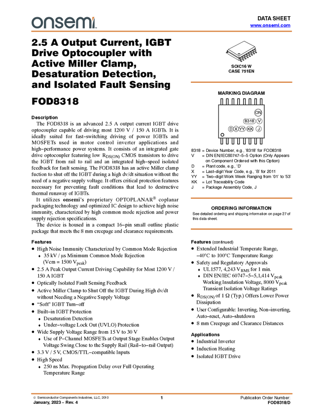 2.5 A Output Current, IGBT Drive Optocoupler With Active Miller Clamp, Desaturation Detection and Isolated Fault Sensing