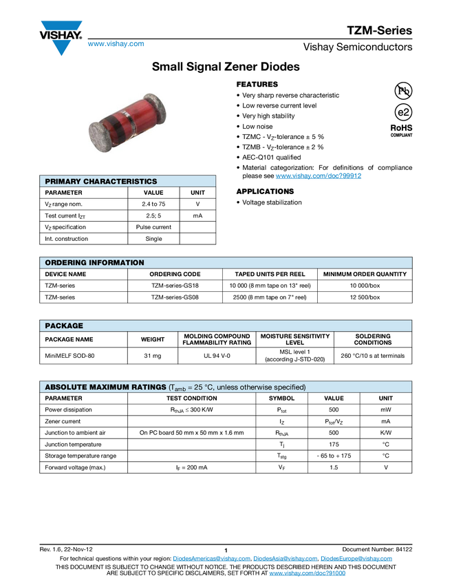 Vishay Dioda Zenera TZMB12-GS08 Typ obudowy półprzewodnika SOD-80 MiniMELF Napięcie Zenera 12 V Moc (maks) P(TOT) 500 mW