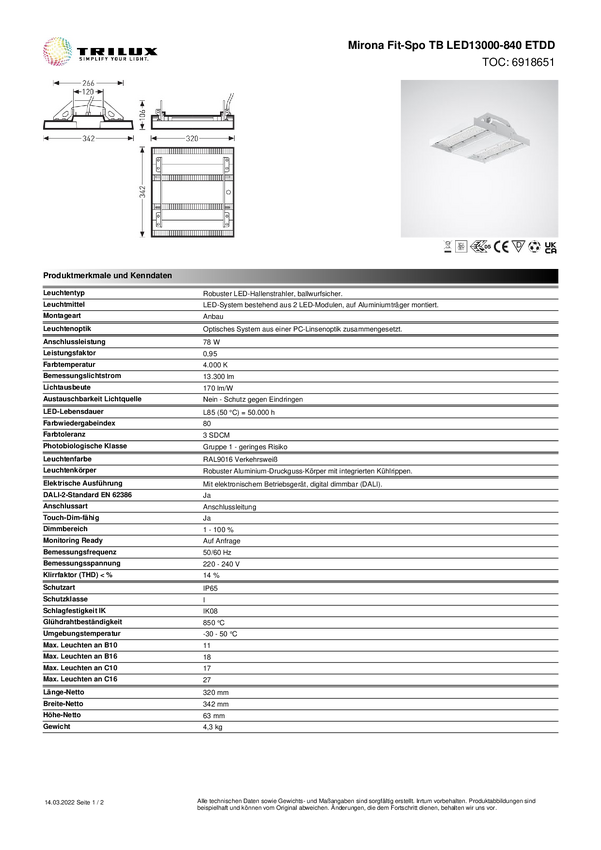 Trilux Mirona Fit- #6918651 6918651 Reflektor LED typu high-bay LED brak 78 W biały
