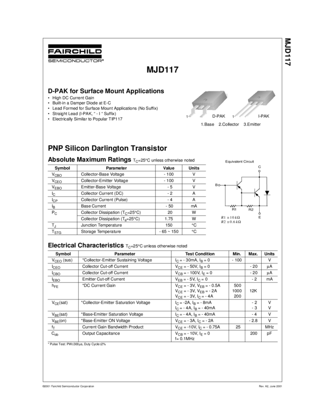 2.0 A, 100 V PNP Darlington Bipolar Power Transistor