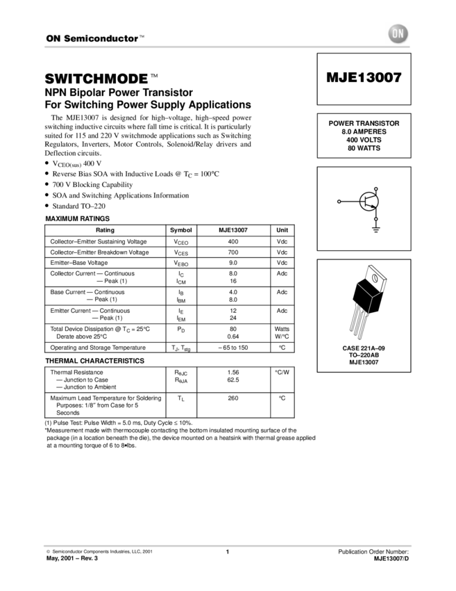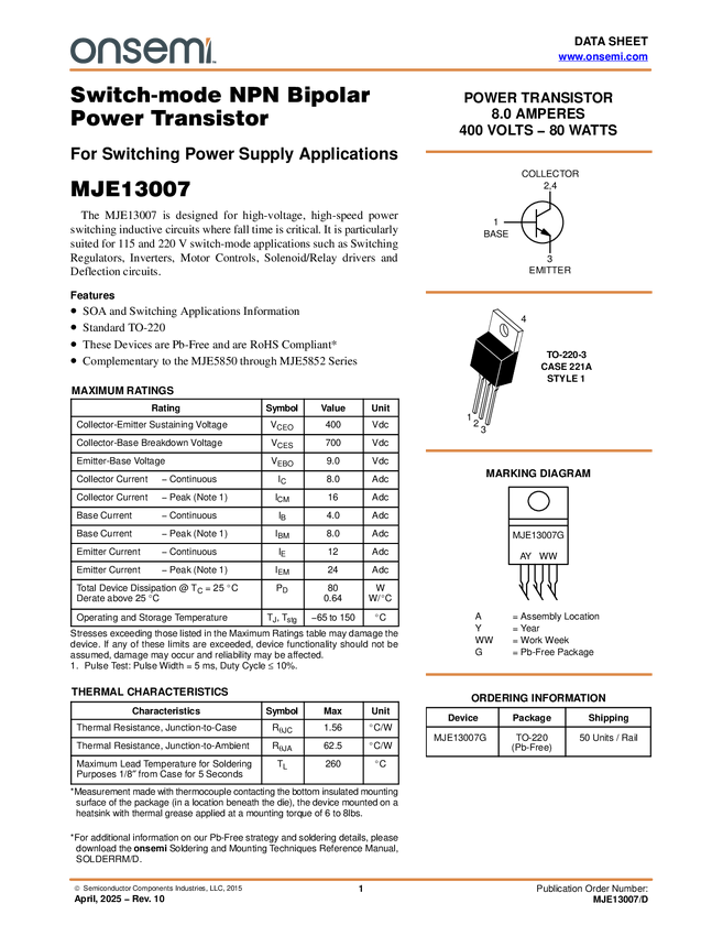 8A Ic, 400V Vce, Silicon Switching Power Transistors NPN, TO-220
