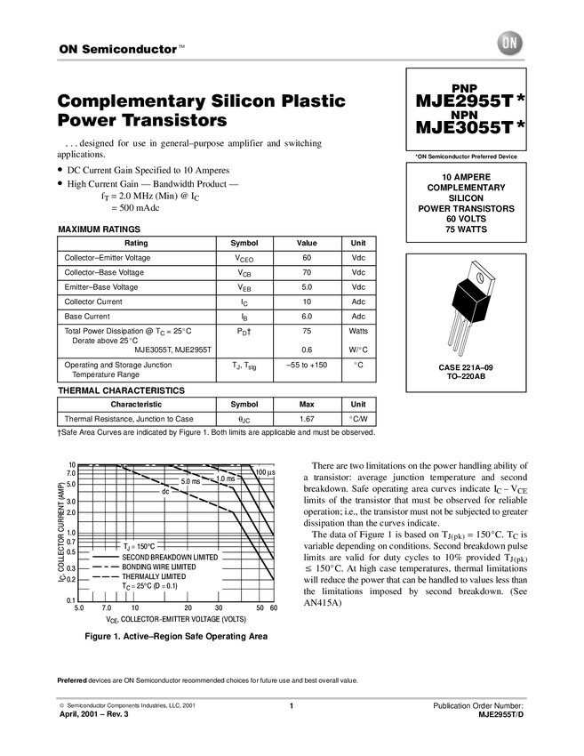 Bipolar Power Transistor, PNP, 10 A, 60 V, 75 Watt