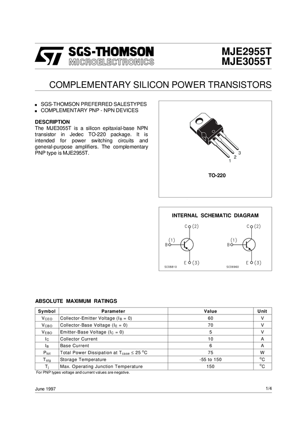 Tranzystor bipolarny ST Microelectronics MJE 2955 T, TO 220, PNP, I(C) -10 A, U(CEO) -60