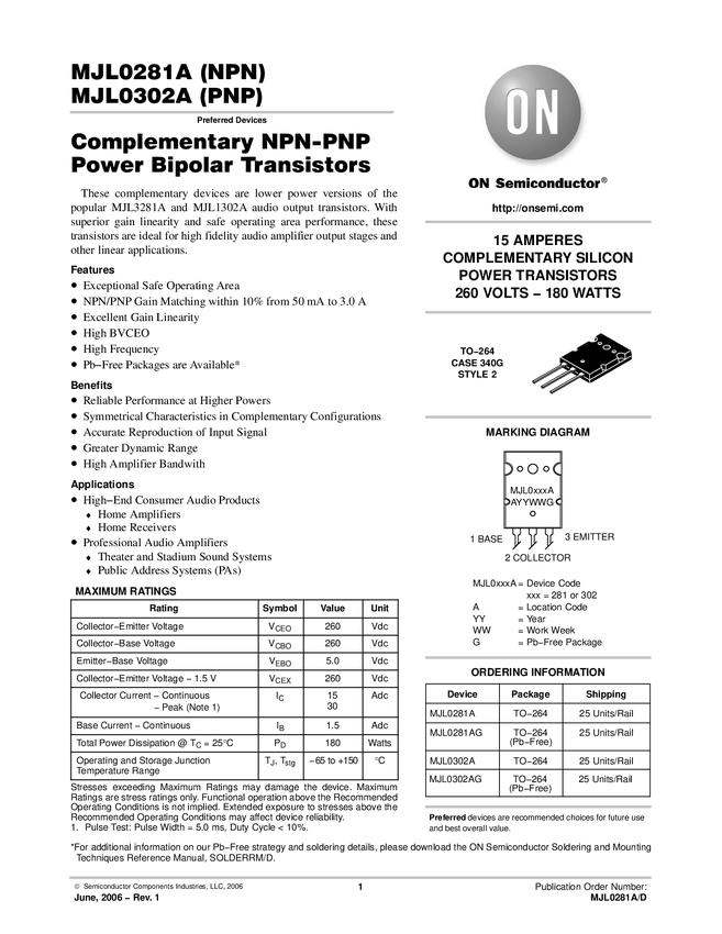 Bipolar Power Transistor, PNP, 15 A, 260 V, 200 Watt